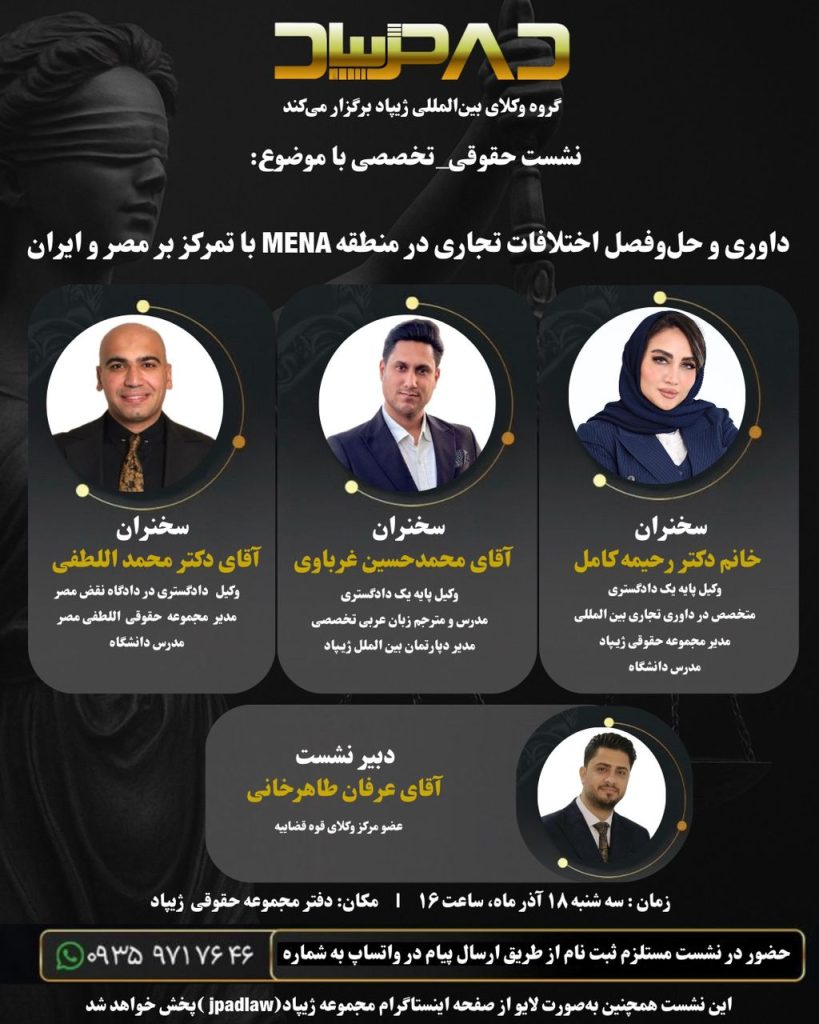نشست حقوقی تخصصی با موضوع: داوری و حل و فصل اختلافات تجاری در منطقه MENA با تمرکز بر مصر و ایران